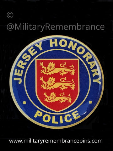 Wear this fantastic round pin depicting the Jersey Honorary Police with pride at any time of the year..